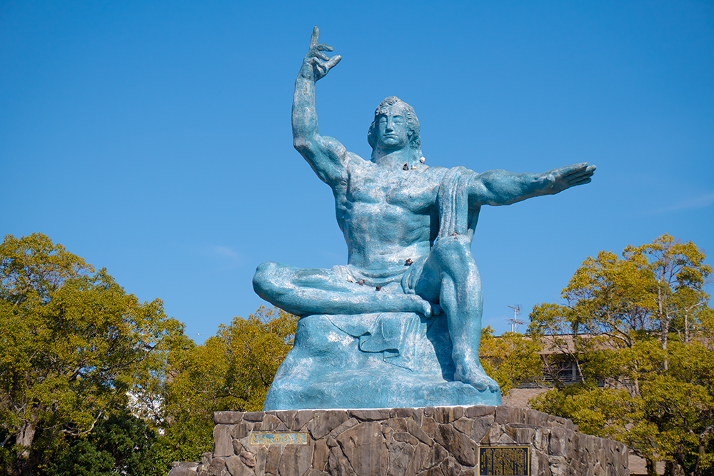 天へ伸びる平和祈念像の腕は、戦争の悲劇を二度と繰り返さないという誓いを示し、