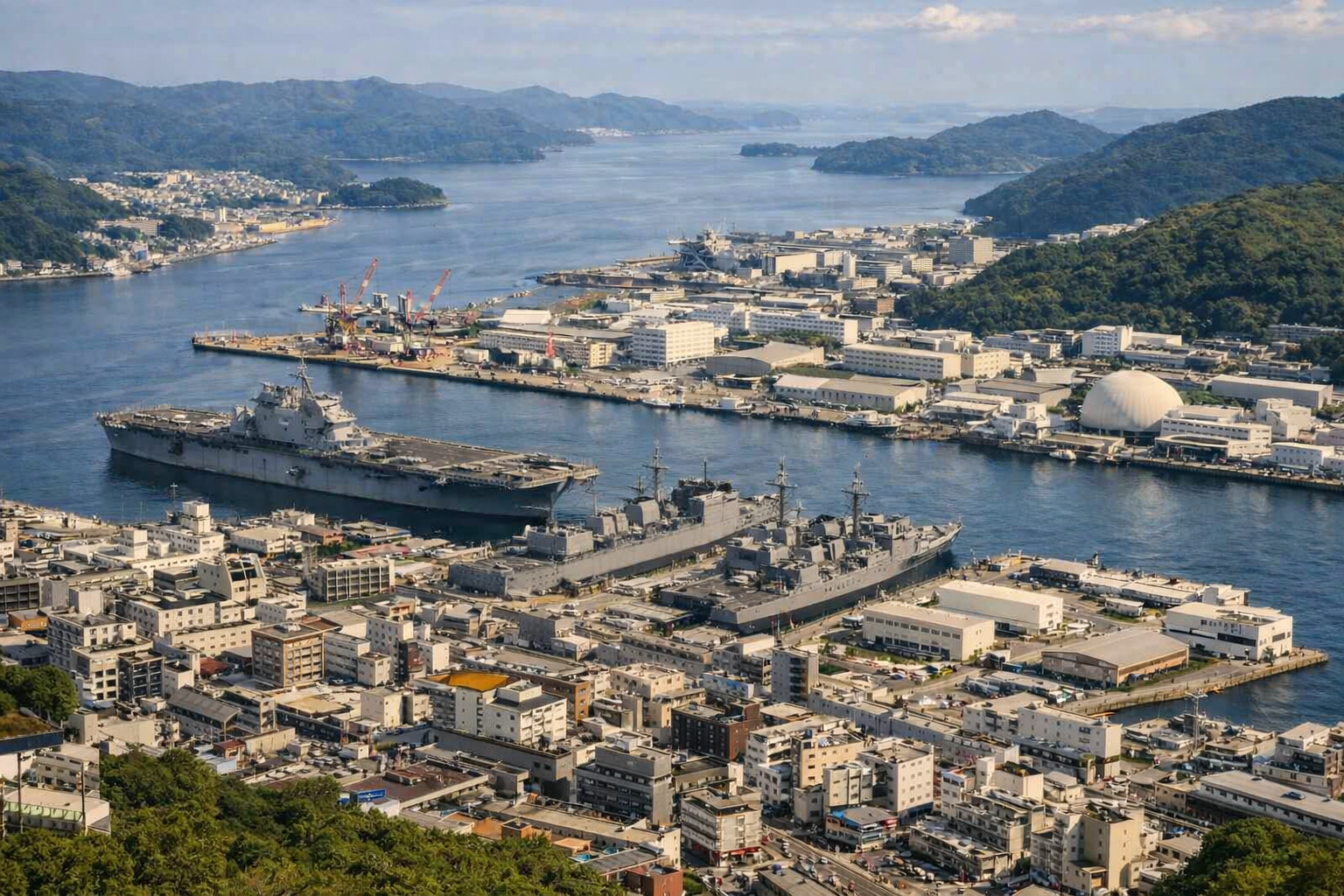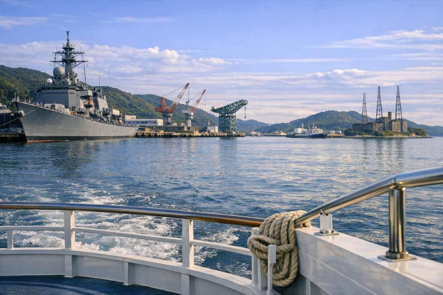 海上から望む艦船や基地の風景が、軍港都市の記憶を静かに語りかける。