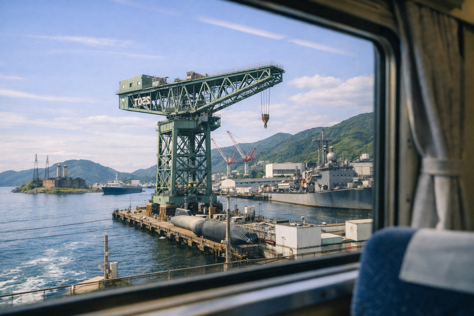 車窓に映る巨大な250トン起重機は、佐世保の産業と軍事の交差点を象徴する存在。