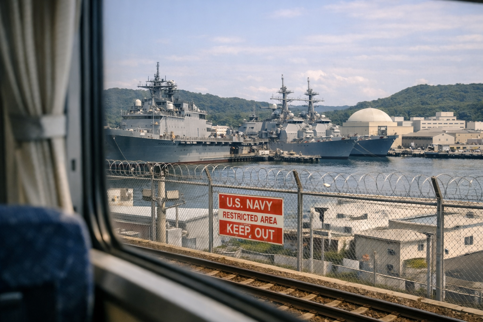 車窓に広がる米海軍佐世保基地の風景。