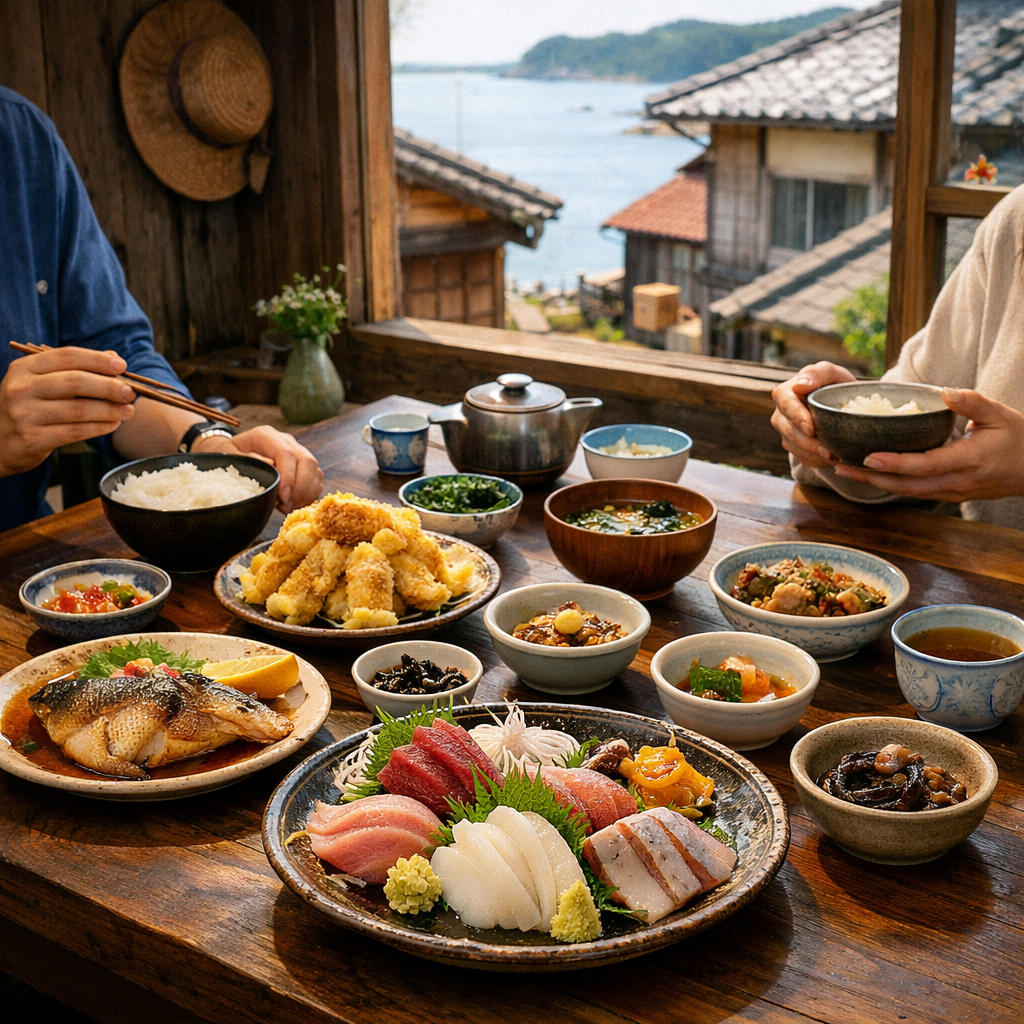 海の恵みを生かした料理や、島の暮らしに根づく家庭的な味が、静かな時間とともに心に染みていく。