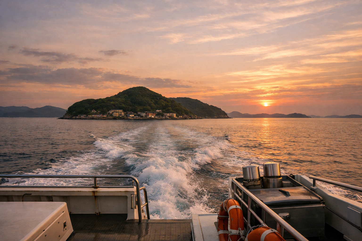 夕暮れが近づく小値賀港を離れ、高速船は静かに島影を後ろへと流していく。
