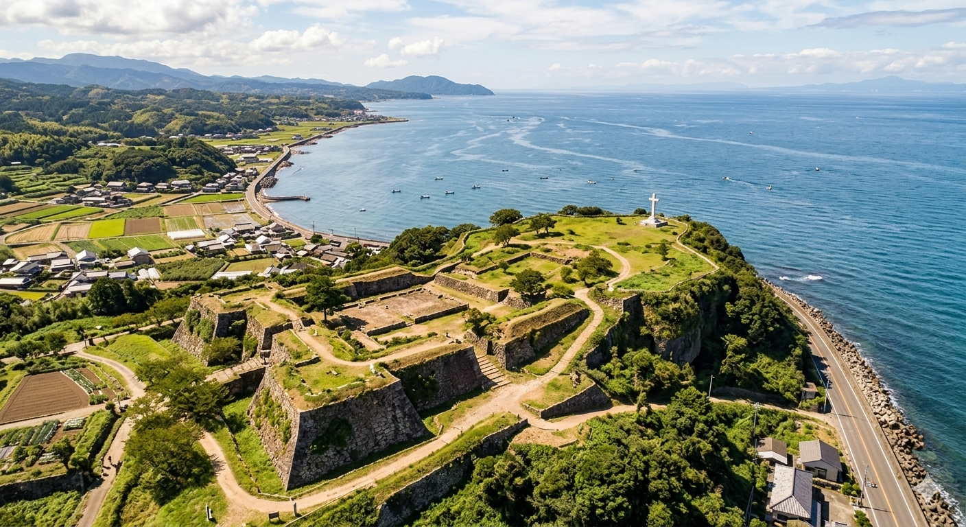 長崎県南島原市にある原城跡は、島原・天草一揆の最後の舞台となった国指定史跡です。現在は穏やかな有明海を望む絶景の地ですが、発掘された石垣や十字架が、かつての激戦と信仰の歴史を静かに伝えています。世界遺産の構成資産の一つです。